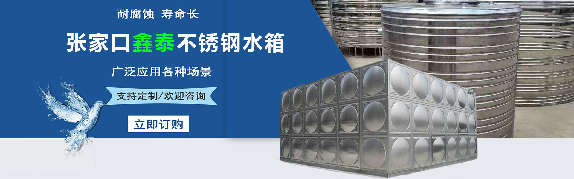 張家口鑫泰不銹鋼制品廠(chǎng)位于河北省張家口市產(chǎn)業(yè)園區(qū),是一家專(zhuān)業(yè)從事不銹鋼水塔,不銹鋼保溫水箱,圓形水箱,方形水箱,消防水箱,承壓水箱,先進(jìn)的生產(chǎn)工藝及銷(xiāo)售一體化,標(biāo)準(zhǔn)化工廠(chǎng);我廠(chǎng)生產(chǎn)的不銹鋼水箱具有外形美觀(guān),耐腐蝕,不長(zhǎng)苔,無(wú)寄生蟲(chóng),安裝方便易清洗等優(yōu)點(diǎn)。產(chǎn)品適用于生活用水,儲(chǔ)水系統(tǒng),消防系統(tǒng),熱水系統(tǒng),水···